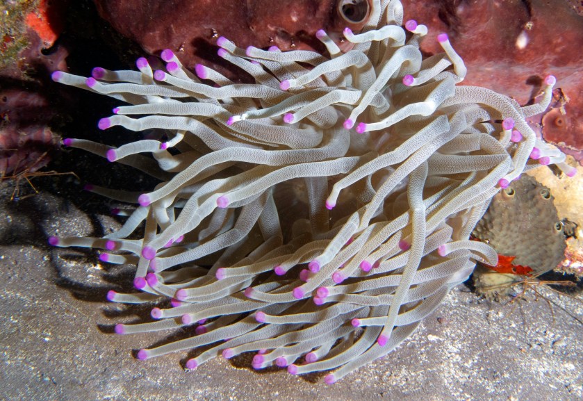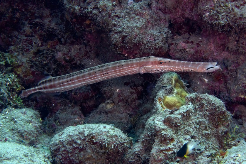 Slender file fish – About two inches long full grown and highly camouflaged to hide in sea fans. Very hard to spot!