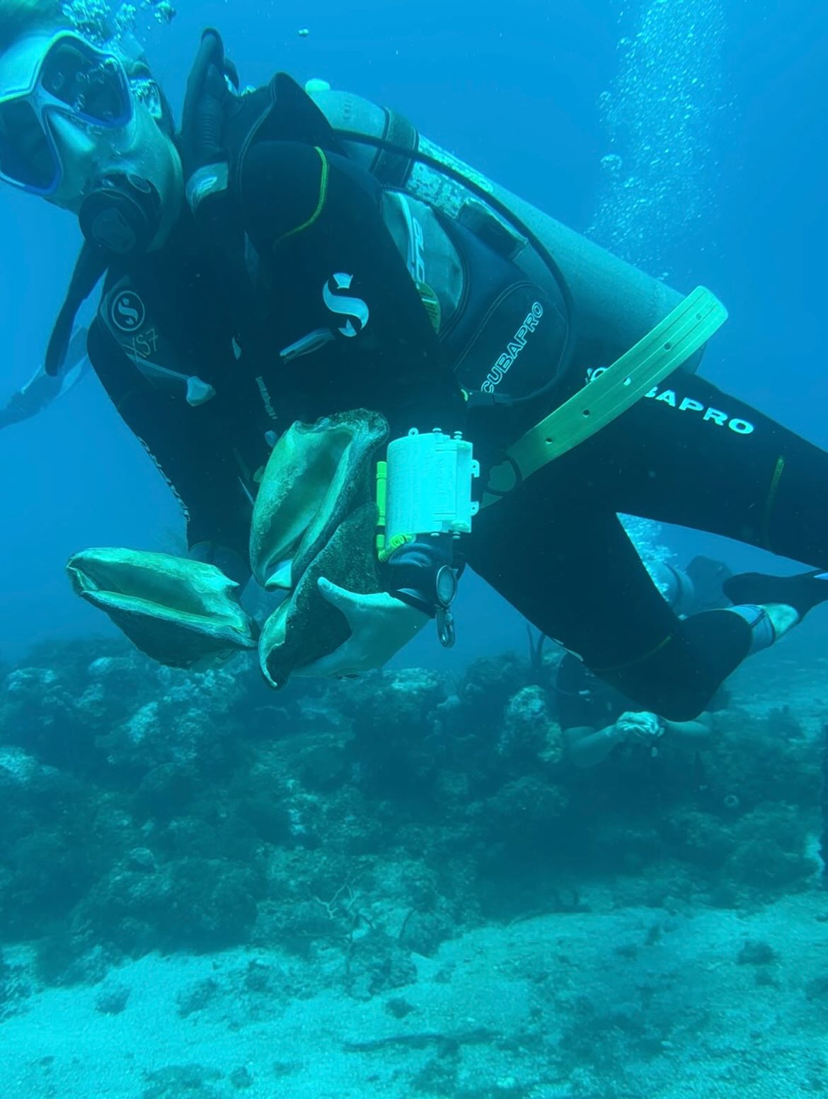 Joe Oliver is the Director of Restoration Operations at Coral Vita, a pioneering organization dedicated to revitalizing the world’s coral reefs. Joe lead us in relocation of invertebrates from the new harbor site to another reef. In a previous dive, they relocated many corals to the protected reef. While many divers focused on the queen conchs, I choose to gather up a bunch of hermit crabs and one arrow crab. These small crabs, being a bit more delicate, Joe personally placed on the protected reef. I was surprised the arrow crab made it alive, but it did!