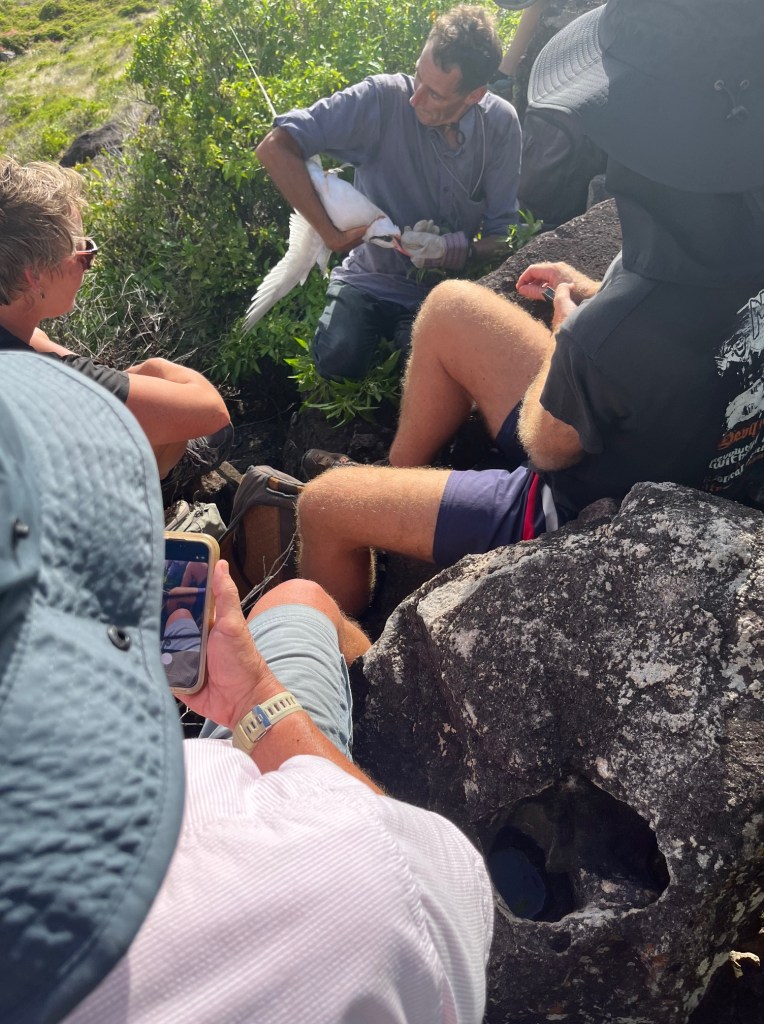 Here, we are perched half way up a mountain with biologist Michiel Boeken tagging a red billed tropic bird. Fun climb and learning experience!